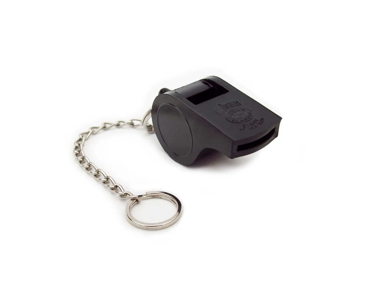 Silbato para tránsito con cadena, ideal para programas de seguridad como “Vecinos Vigilantes”. Fabricado en baquelita termofija de alta calidad, ofrece resistencia y durabilidad para uso constante.